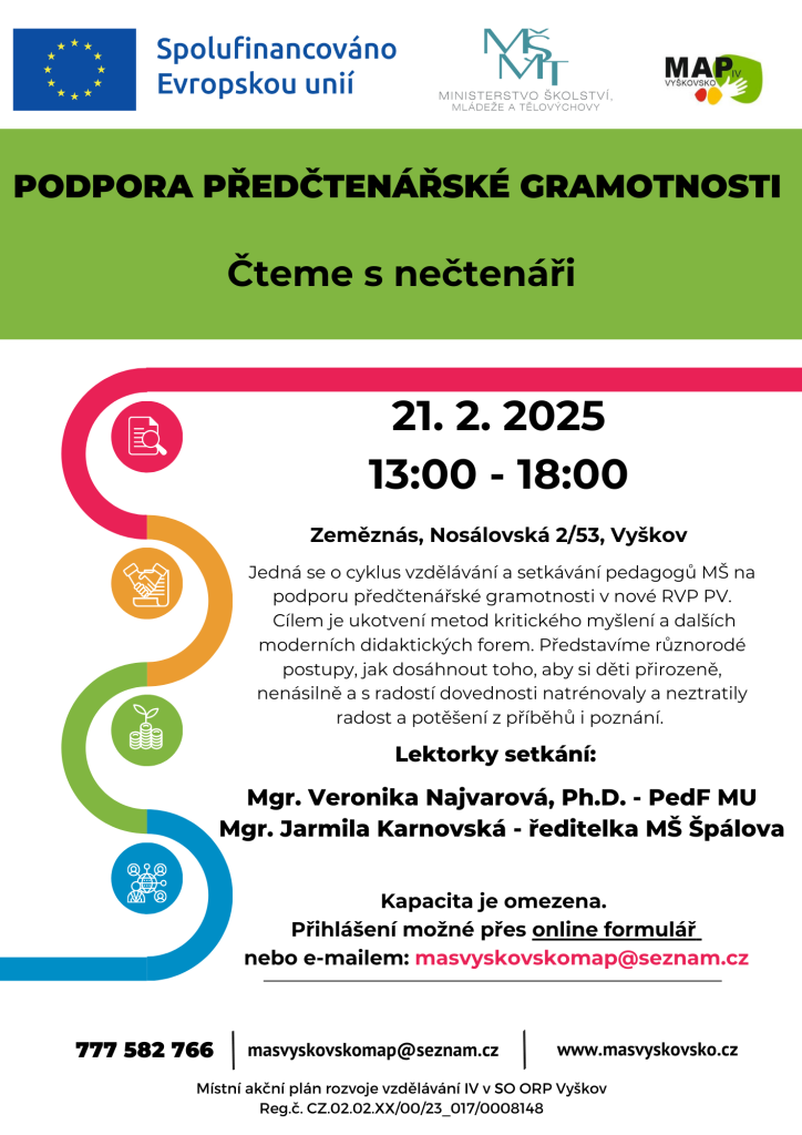 Jedná se o cyklus vzdělávání a setkávání pedagogů MŠ na podporu předčtenářské gramotnosti v nové RVP PV. Cílem je ukotvení metod kritického myšlení a dalších moderních didaktických forem.