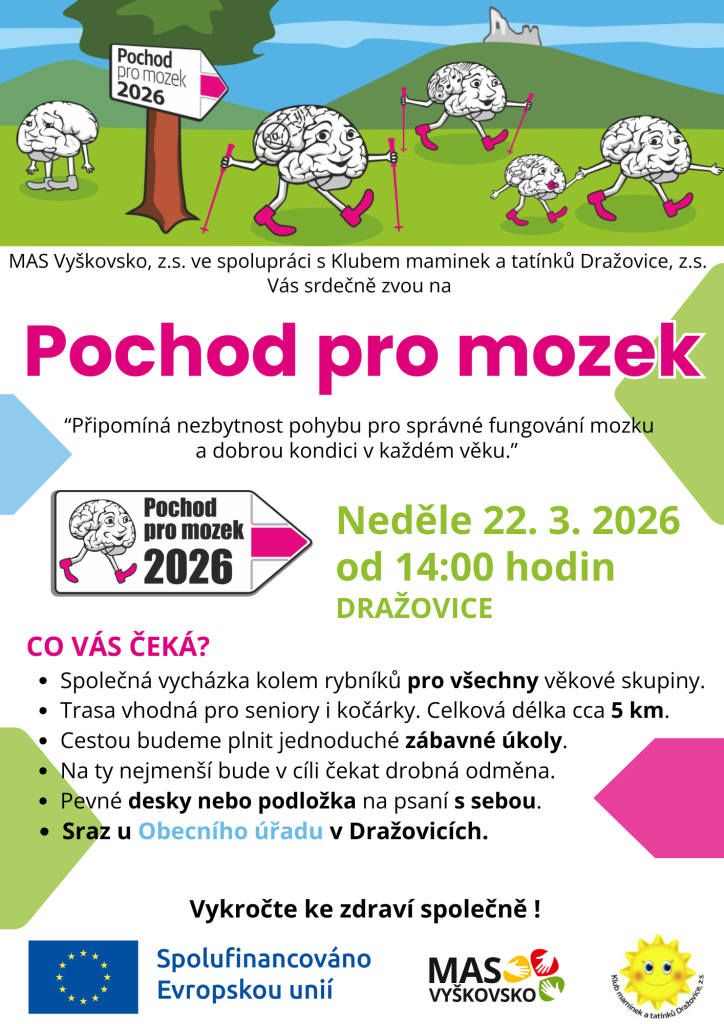 MAS Vyškovsko, z.s. a Klub maminek a tatínků Dražovice, z.s. vás srdečně zvou na Pochod pro mozek, který pořádají v rámci Národního týdne trénování paměti. Akce je vhodná pro všechny – od dětí v kočárcích až po seniory.