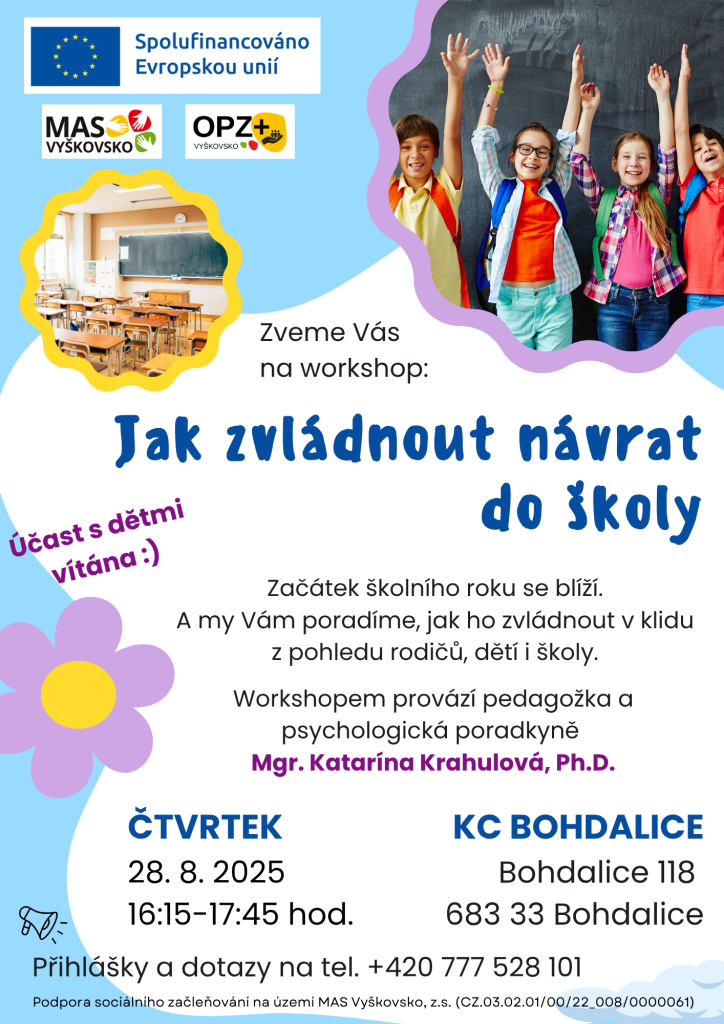 Na konci srpna se v Komunitním centru v Bohdalicích bude konat workshop na téma "Jak zvládnout návrat do školy".