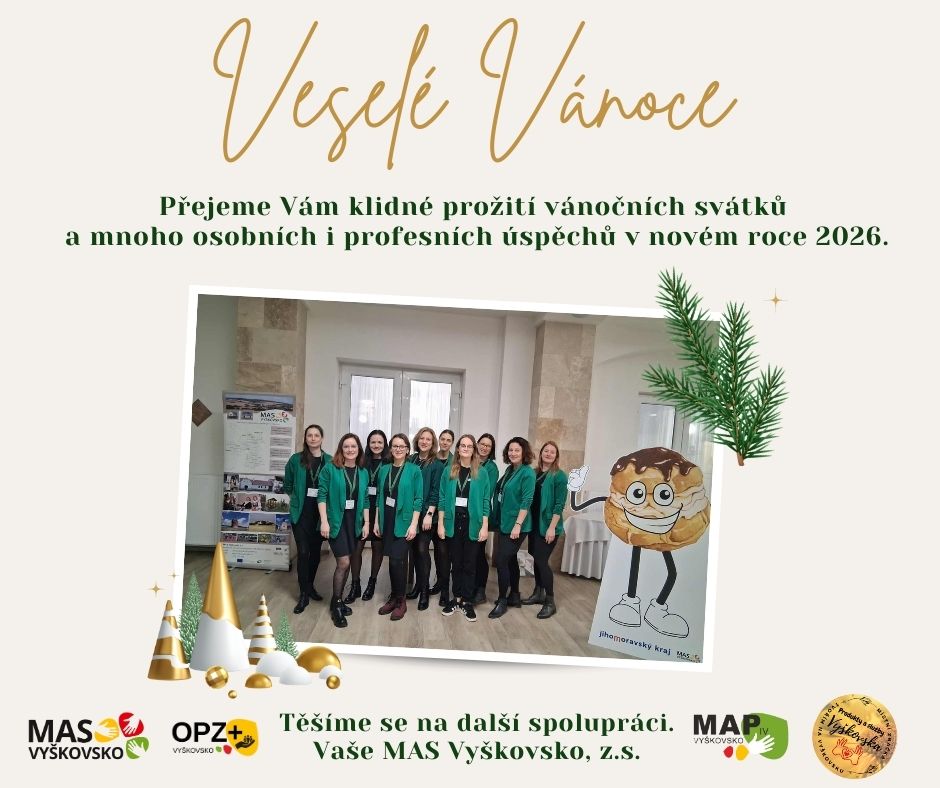 Milí přátelé MAS Vyškovsko,✨ přejeme Vám Veselé Vánoce, klidné prožití vánočních svátků a úspěšný vstup do Nového roku 2026. PF 2026 MAS Vyškovsko, z.s.