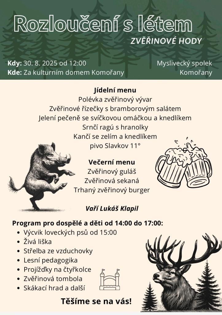 Akce se koná 30. 8. 2025 za obecním domem v Komořenech od 12. hodin. Těšit se můžete na jídelní a večení zvěřinové menu. Od 14. hodin také začíná doprovodný program pro děti i dospělé. Čeká Vás tombola, skákací hrad, projížďka na čtyřkolce a další. Těšíme se na Vás.